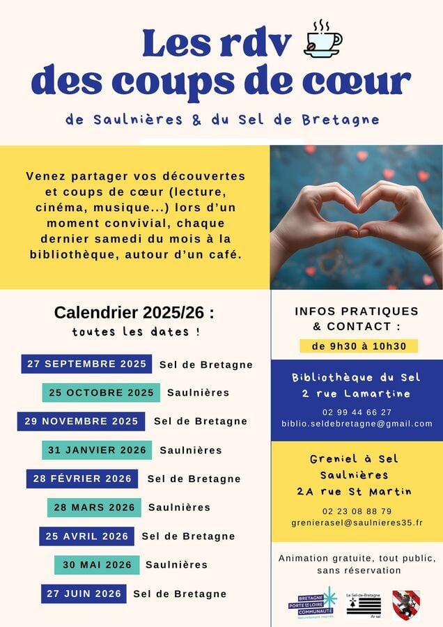 La bibliothèque du Sel-de-Bretagne et le Grenier à Sel de Saulnières s’associent pour vous proposer un "rendez-vous des coups de cœur" par mois, alternativement au Sel-de-Bretagne et à Saulnières.